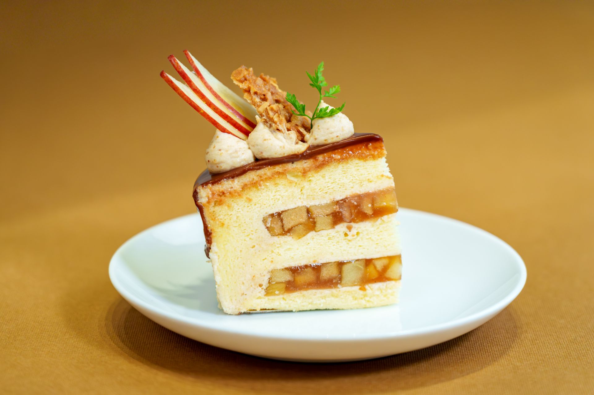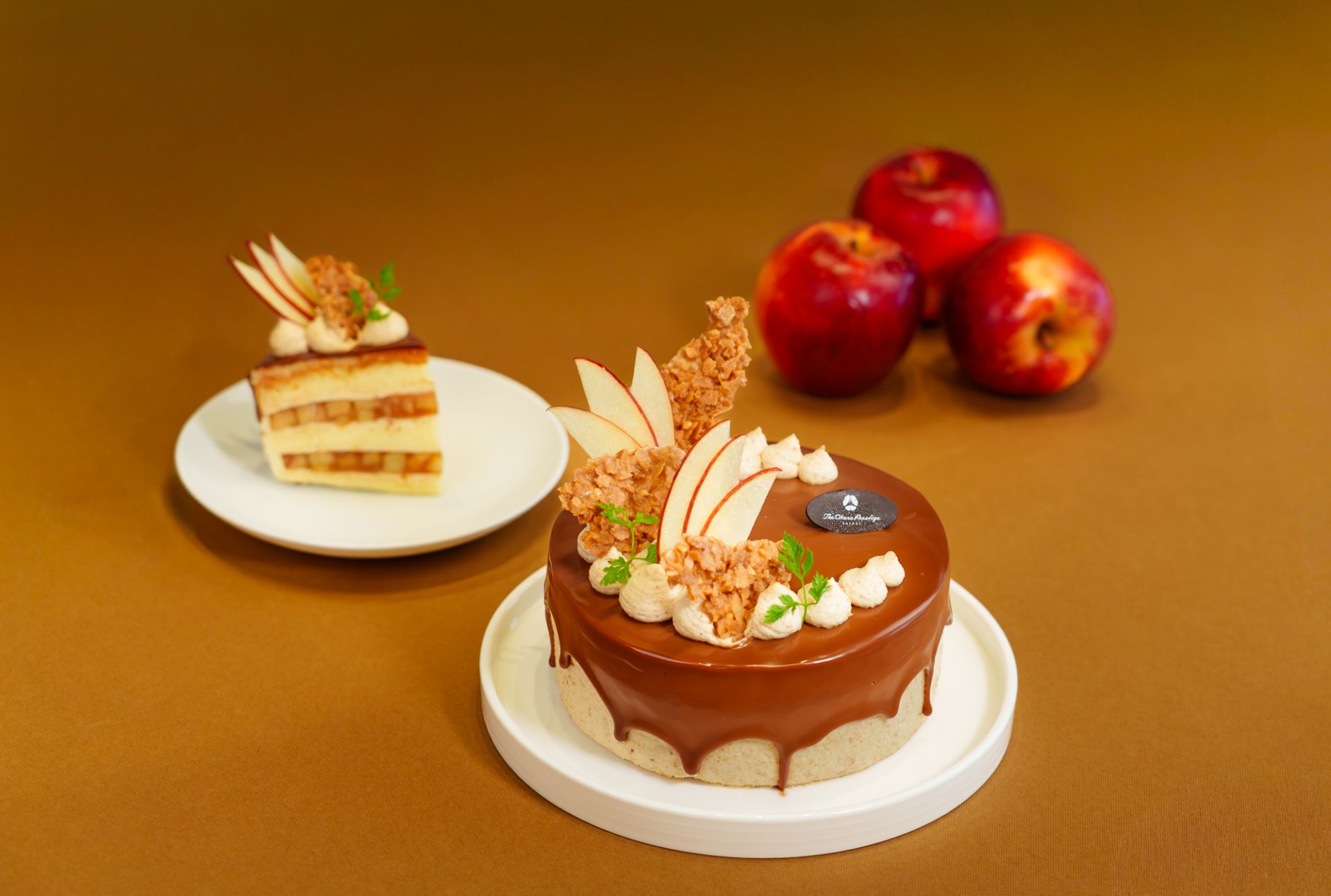表層覆以光澤焦糖淋面,點綴酥脆花生脆片與薄切蘋果片,呈現豐富層次與秋日的溫暖氣息。