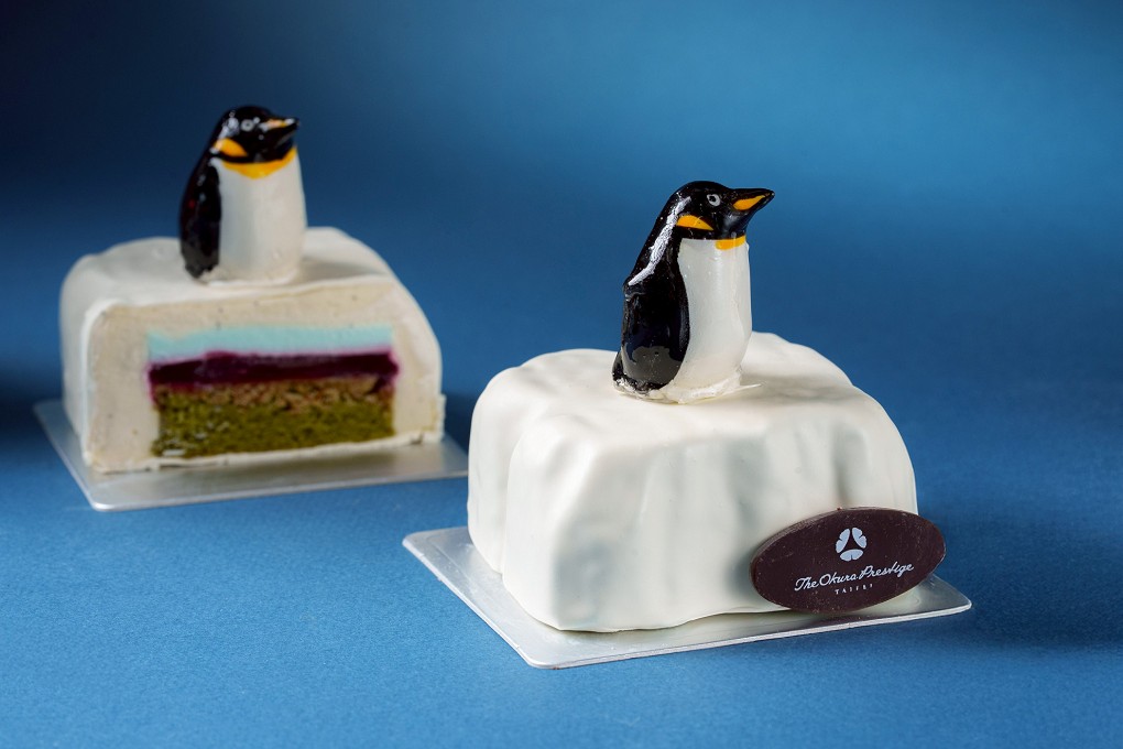 在極光之下站在香草白巧克力冰山上的小企鵝,由藍柑橘酸奶慕斯在內層融出清新純白的冰原風味,覆盆子庫利以酸甜點亮味蕾,再搭配開心果巴芮脆片與費南雪蛋糕,細緻、豐富的口感,令人想再走進極光之境。